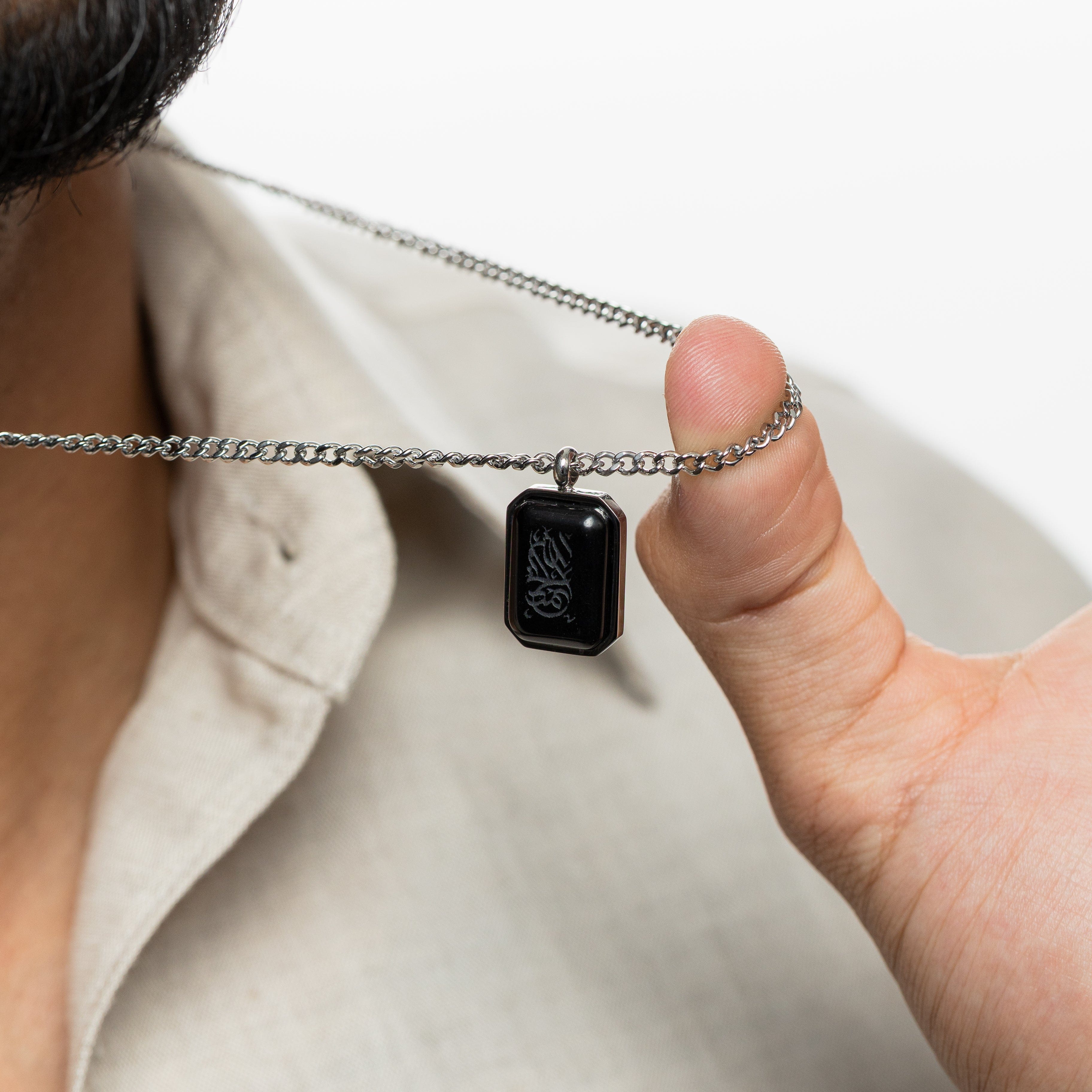Grounded in strength, this necklace features genuine Black Obsidian stone. At its center, the stone is engraved with الحمد لله (Alhamdulillah) — All praise is due to God — a reminder of gratitude and perspective carried close to the heart. Finished in a clean silver, this piece pairs timeless faith with the raw beauty of natural stone.