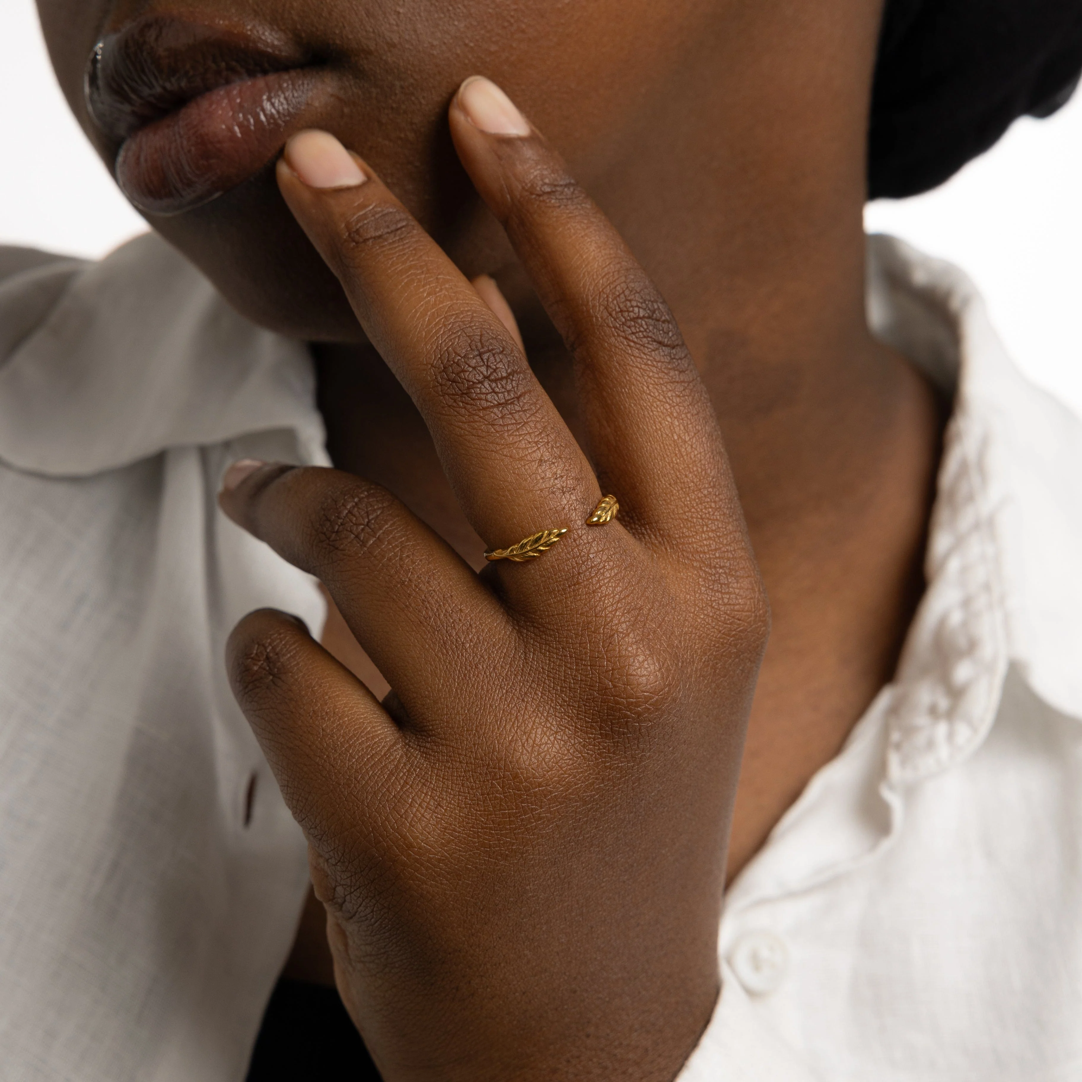 Marked by olive leaves at the end of an open band, this piece is inspired by the resilient Palestinian olive trees that can grow, even amidst a drought. This ring is meant to instill a sense of resilience in your everyday life.